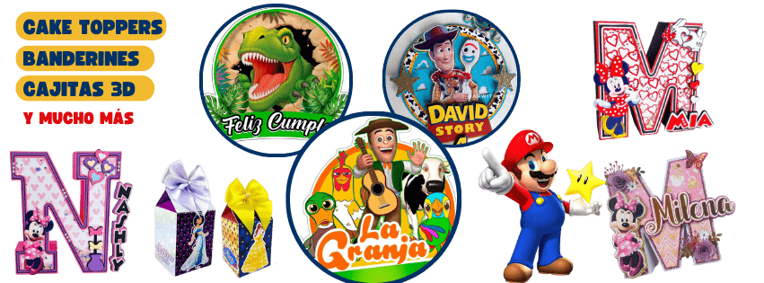 85 Mil diseños totalmente editables y de alta calidad, cake toppers, Banderines, cajas 3D y mucho más