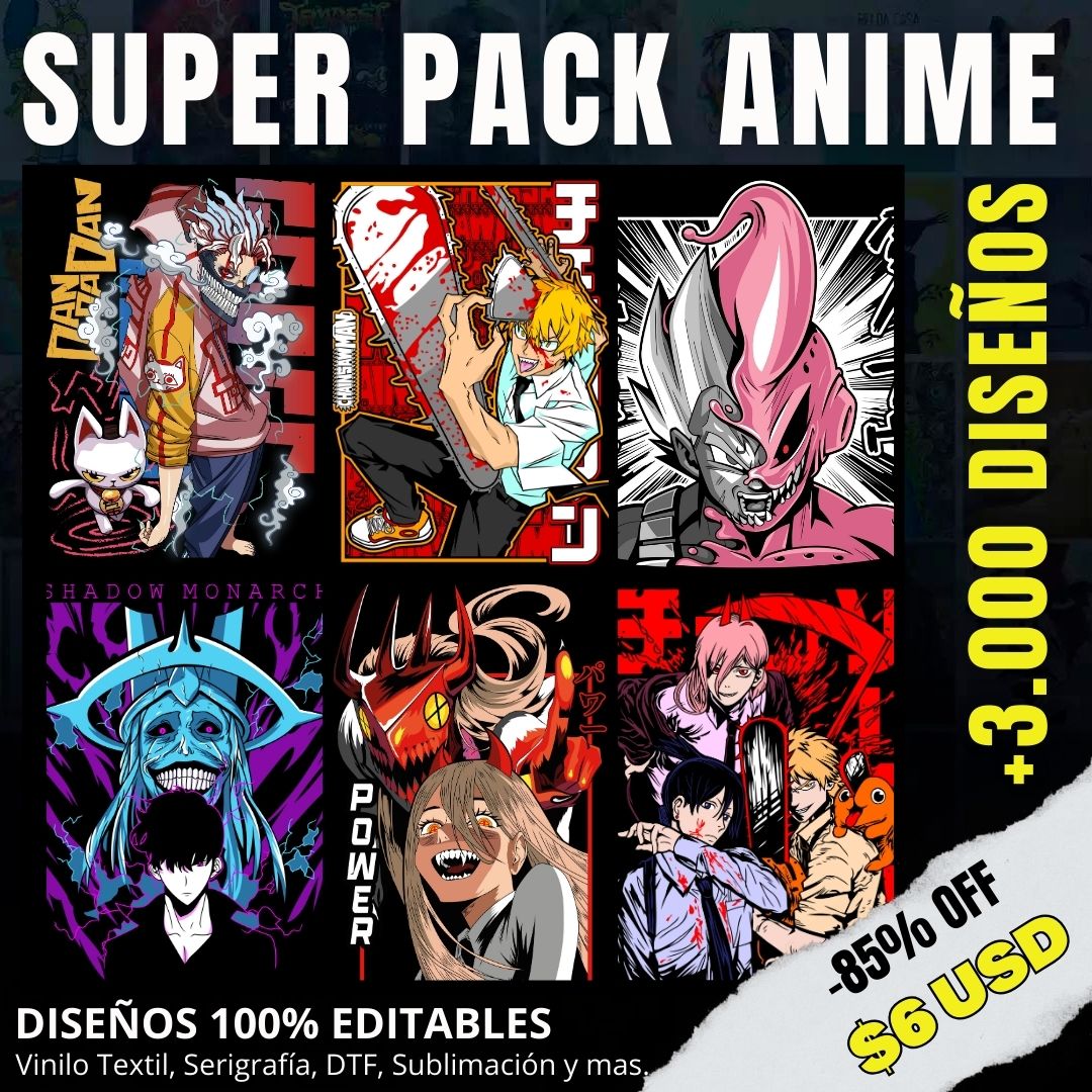 Con este Mega Pack de +3000 Diseños de Anime, tendrás acceso a una colección exclusiva de ilustraciones listas para imprimir en vinil, serigrafía, DTF, DTG, sublimación y más.